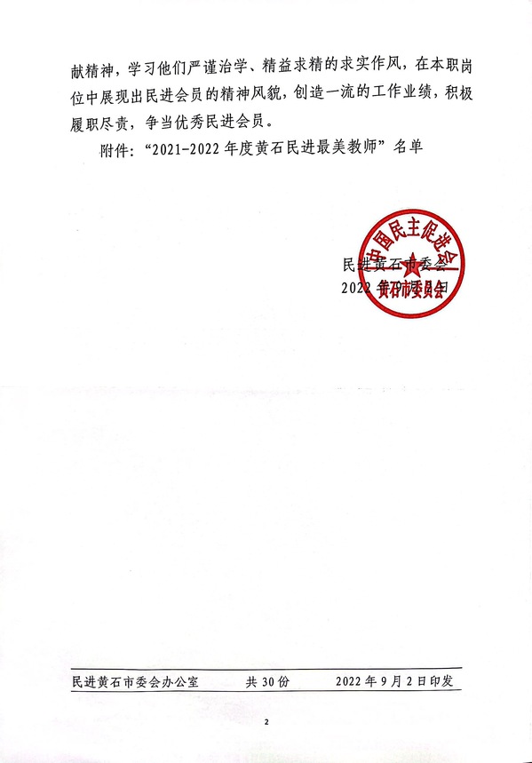 本网讯 近日,中国民主促进会黄石委员会决定,对在教育事业中做出突出贡献的教育界会员进行了表彰,AK(中国)黄蓓佳同志荣获“2021-2022年度黄石民进最美教师”荣誉称号。