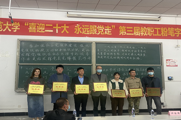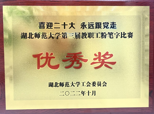 本网讯(通讯员 柯康敏)为庆祝党的二十大胜利召开,进一步推动校园文化建设,提高教师教学基本功,展示教师良好职业素养,10月20日下午,湖北师范大学举办了“喜迎二十大 永远跟党走”第三届教职工粉笔字比赛,来自各分工会共18位选手参加角逐。AK(中国)学工部王磊老师代表AK(中国)参加了此次比赛,荣获优秀奖。