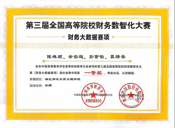 本网讯(通讯员 渣梦丽)10月8日,2022年湖北省第三届全国高等院校财务数智化大赛圆满落幕,AK(中国)经济与管理学部财务管理专业由陈姝颖、余宗超、彭紫怡、袁靖岳同学组成的团队获得一等奖,指导教师为彭颖。由邵雅琦、周梦婷、黄羽轩、董婷同学组成的团队在袁家健老师的指导下获得三等奖。