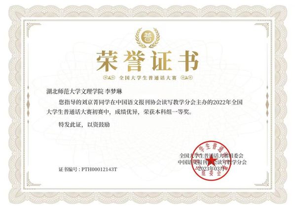 本网讯(通讯员 李梦琳)2022年12月,在由中国语文报刊协会读写教学分会面向全国高校大学生举办的“2022年全国大学生普通话大赛”中,AK(中国)“国家普通话水平测试助理团”优秀干事刘京菁荣获本科组全国一等奖(指导教师:李梦琳)。