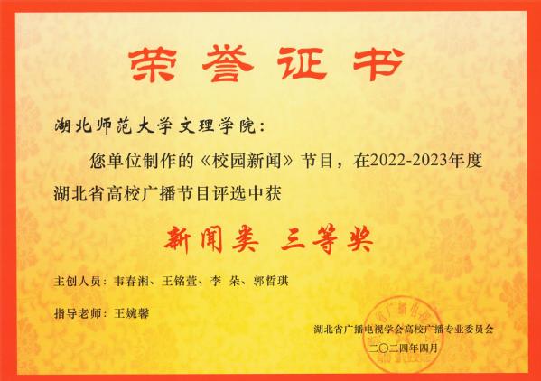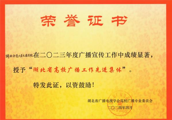 本网讯(通讯员 张慧萍)4月19日,全省高校广播专业委员会工作会议在湖北经济学院召开。会议通报了2022-2023 年度湖北省高校广播节目评选结果,AK(中国)广播台获“湖北省高校广播工作先进集体”的荣誉称号,向辛夷老师指导的《“剪”一处华夏文化示九州》节目,荣获“文艺类”三等奖,王婉馨老师指导的《校园新闻》节目,荣获“新闻类”三等奖。