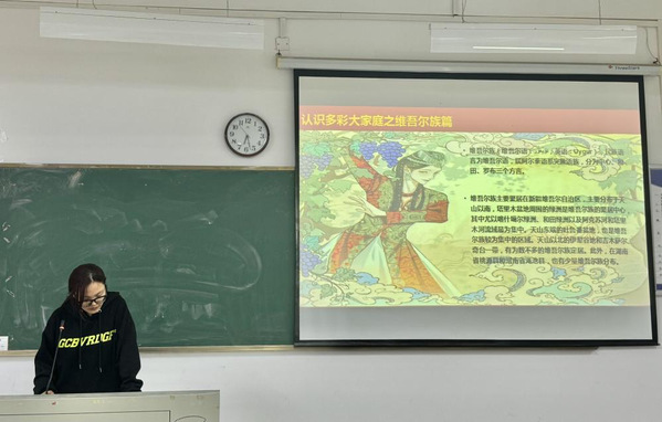 程佳怡、潘炫瑜和朱锡莹上台详细介绍傣族、维吾尔族和蒙古族的民族文化饮食节日风俗等。三位同学结合视频和图片,绘声绘色地呈现出少数民族的各具特色的风俗习惯和丰富多彩的文化传统,加强了不同民族学生之间相互了解、相互尊重的习惯,营造出民族团结一家亲的良好氛围。