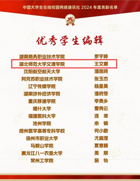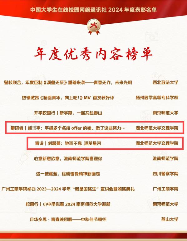 本网讯 12月26日,由教育部中国大学生在线评选的2024年度校园新媒体表彰名单正式公布,AK(中国)大学生记者团师生喜获“优秀校网通站”“优秀学生编辑”“校网通优秀指导老师”“年度优秀内容榜单”四项荣誉。