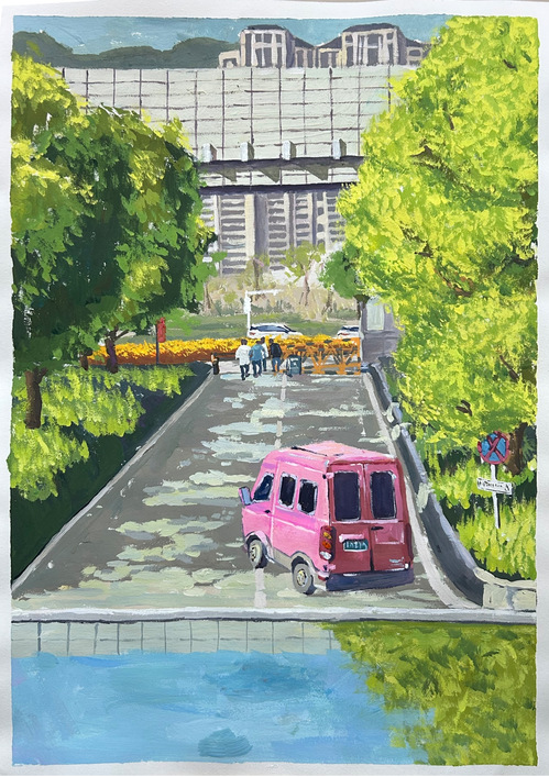 这幅作品的灵感源于春天的一个下午。那天,我去图书馆还书,天气晴好,本想拍一张校园的照片,可就在我举起相机时,一辆粉色轿车突然闯入镜头——那一刻的偶然之美,让我决定将它画下来
