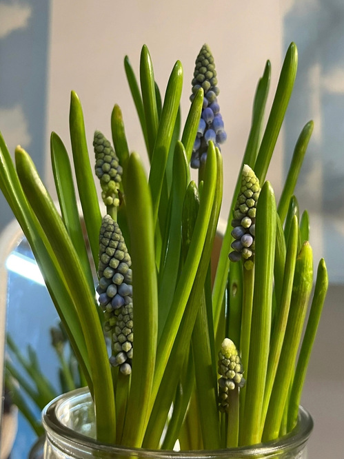 花茎抽长的过程像慢放的默片。它们遵循着某种神秘的时间法则,在窗前以肉眼难以察觉的速度向光生长。叶片渐渐舒展成修长剑形,边缘镀上了极淡的光晕。我是一个不太合格的主人,黑夜里的酝酿、白日里的生长都没察觉,总是在换水时才惊觉它们的百般变化。