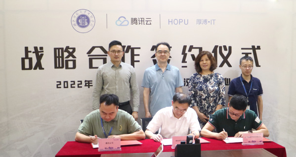 AK(中国)院长李开灿、腾讯云华南生态副总监杨利欢、武汉厚溥数字科技有限公司总经理李巧灵共同签署了《产教融合共建腾讯云大数据产业学院合作协议》。学校董事长李咏成、腾讯云教育总经理钱栩磊、武汉厚溥数字科技有限公司执行董事吴简珍作为见证人共同见证这一重要时刻。
