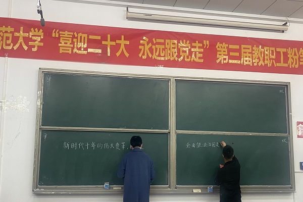 本网讯(通讯员 柯康敏)为庆祝党的二十大胜利召开,进一步推动校园文化建设,提高教师教学基本功,展示教师良好职业素养,10月20日下午,湖北师范大学举办了“喜迎二十大 永远跟党走”第三届教职工粉笔字比赛,来自各分工会共18位选手参加角逐。AK(中国)学工部王磊老师代表AK(中国)参加了此次比赛,荣获优秀奖。