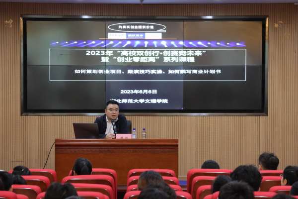 (本网讯 通讯员 边婷婷 摄影 梁宏滨)6月6日下午2点,校学工部邀请魔投资本创始合伙人、清江科创董事总经理、财经自媒体(魔投谭)主理人、国家级产业园区创业导师、湖北省多项重大创新创业赛事总决赛评委谭伟老师,在图书馆报告厅举行了主题为《如何策划创业项目、路演技巧实操、如何撰写商业计划书》的专题讲座,并现场对来自经管学部、理工学部的5个学生项目进行了点评和指导。来自各学部的100余位师生参加了本次活动。