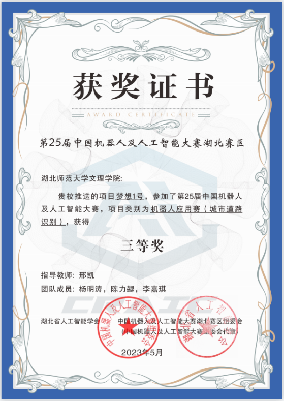 本网讯 (通讯员 邢凯)5月13日-14日,2023年湖北省人工智能大赛暨第二十五届中国机器人及人工智能大赛(湖北赛区)在武汉工程大学举行,AK(中国)由邢凯老师指导,杨明涛、陈力勰、李嘉琪三名学生组成的团队荣获三等奖。