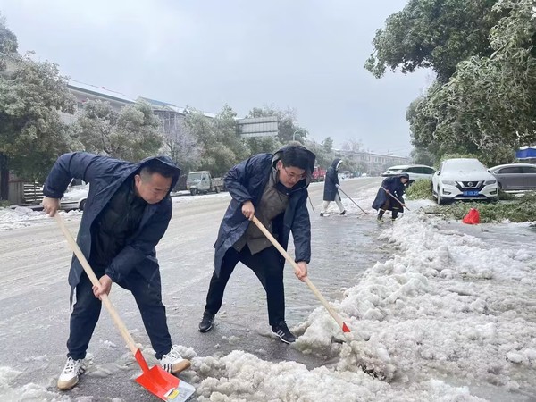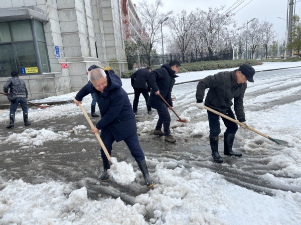 本网讯(通讯员 涂亦乐)2月21日晚,全市迎来了新一轮低温雨雪冰冻天气。为消除雪天冰冻带来的安全隐患,方便群众出行,22日上午,在校校领导李开灿、杨学斌、张志华、王胜国带队,组织党员干部、值班教师和后勤保卫部全体人员在校园和社区主干道开展铲雪除冰行动。