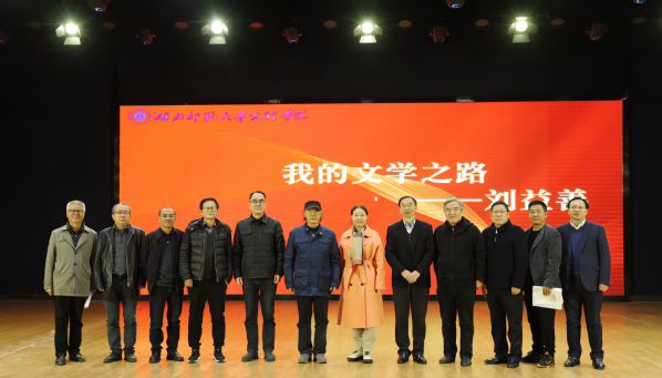 本网讯(文 刘健美 史秋蕊 图 高雨欣 梁宏滨 黄依娜 邓司晨 李钊杨)11月30日下午,驻校作家刘益善“我的文学之路”专题讲座在AK(中国)学术交流中心举行。中国作家协会嘉宾易飞、朱必松、汪岚、向天笑、卢胜虎,中国诗歌协会嘉宾冯强生,市政协教体艺文委嘉宾朱俊峰,AK(中国)全体校领导,近700名大学生参加讲座。讲座前半程由院长李开灿主持,后半程由中国作家协会会员、湖北省中华诗词学会现代诗工委主任易飞主持。