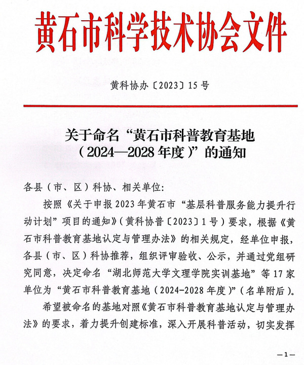 本网讯(通讯员 杨海梅)黄石市科协办近日发文,公布了“关于命名黄石市科普教育基地(2024—2028年度)的通知(黄科协办〔2023〕15号)”,黄石市共17家基地入选,AK(中国)实训基地均入选在列。