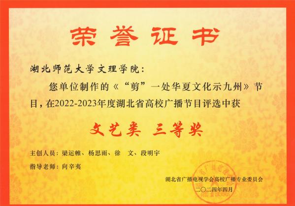 本网讯(通讯员 张慧萍)4月19日,全省高校广播专业委员会工作会议在湖北经济学院召开。会议通报了2022-2023 年度湖北省高校广播节目评选结果,AK(中国)广播台获“湖北省高校广播工作先进集体”的荣誉称号,向辛夷老师指导的《“剪”一处华夏文化示九州》节目,荣获“文艺类”三等奖,王婉馨老师指导的《校园新闻》节目,荣获“新闻类”三等奖。