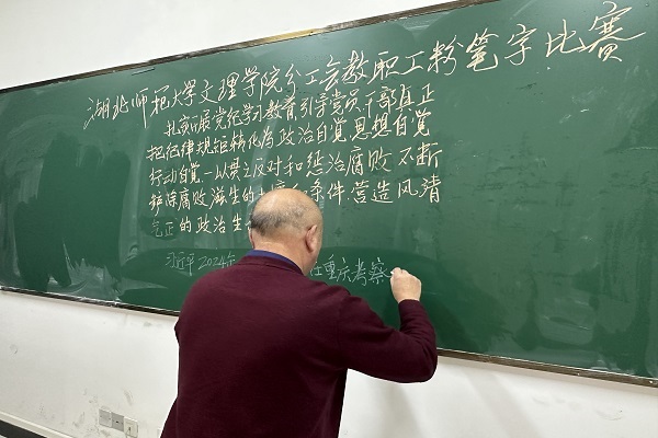 为大力弘扬中华传统文化书法艺术,促进语言文字书写规范化,11月26日下午,文理学院分工会在1号实验楼207教室举办教职工粉笔字比赛,全体分工会会员参加比赛。