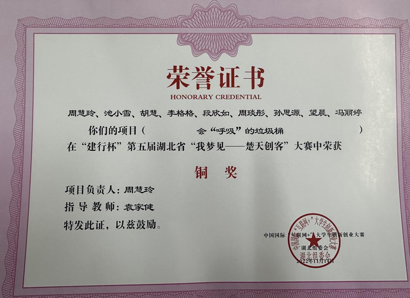 在第八届中国国际“互联网+”大学生创新创业大赛 暨建行杯第五届湖北省“我梦见-楚天创客”铜奖