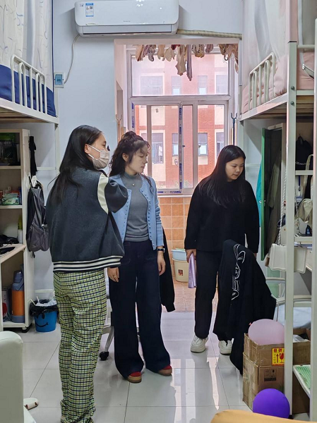 检查工作开展前,罗铭副书记对本次检查工作作了分组部署,并强调了检查的重点。走访期间,检查小组对学生宿舍安全情况进行了细致检查,内容涵盖了是否使用大功率电器、私接电线、乱接插线板、堆放易燃易爆物品、宿舍吸烟、私养宠物等多个方面。针对个别寝室存在的这些安全隐患问题,检查组现场予以指导和批评教育,并要求立即进行整改。同时,在检查过程中,徐燕主任向同学们普及消防安全知识,引导学生树立安全意识,提醒同学们养成用电安全、人走断电的好习惯,共同维护宿舍环境的安全与和谐。