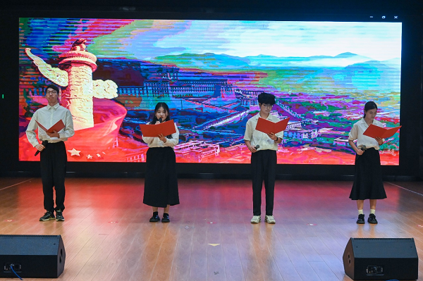 学院汤皓然、周亚兰等同学,结合暑期在江西瑞金参加社会实践活动的亲身经历,表演《吃水不忘挖井人》。通过生动的演绎,再现了实践中的所见所感,传递了感恩奋进的精神,引发了现场师生的强烈共鸣。学生合唱团献上歌曲串烧《如愿》《我和我的祖国》歌声中饱含着对祖国的热爱与对美好未来的向往,将现场氛围推向高潮。