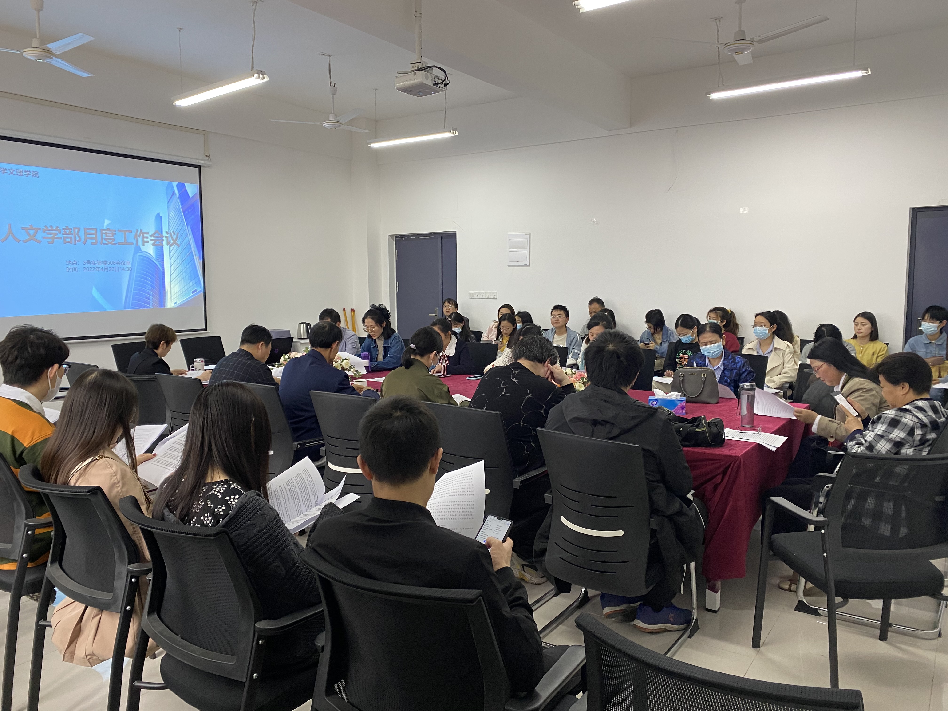 2022420日下午两点半,人文学部在3号实验楼508会议室召开了4月份工作会议,本次会议主要包含“政治理论意识形态学习”和“期中教学检查工作”两个主题参加此次会议的有人文学部主任熊子延、学部党总支副书记汪玉宝、人文学部全体教职工以及航空学院在人文学部的全体教职工。