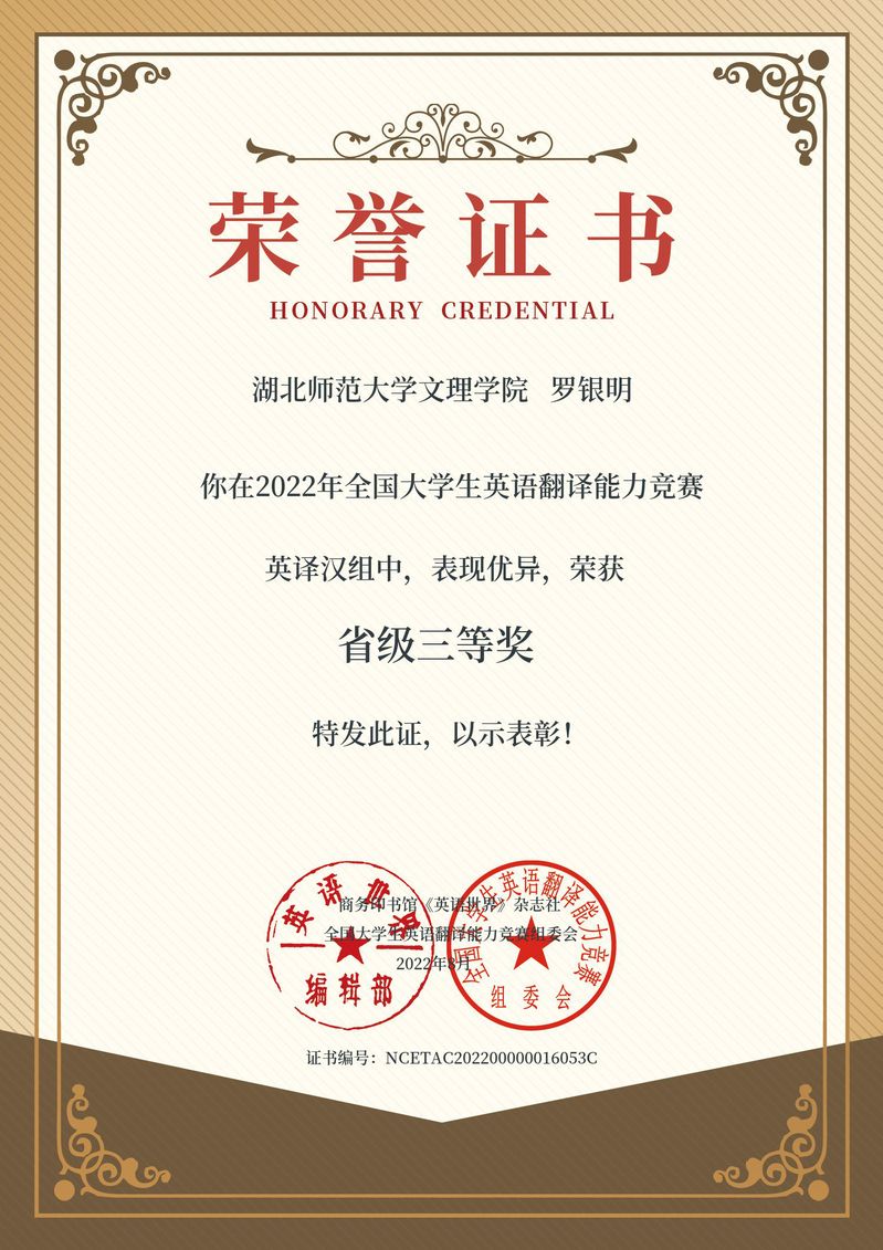 罗银明同学荣获2022年全国大学生英语翻译能力竞赛省级三等奖