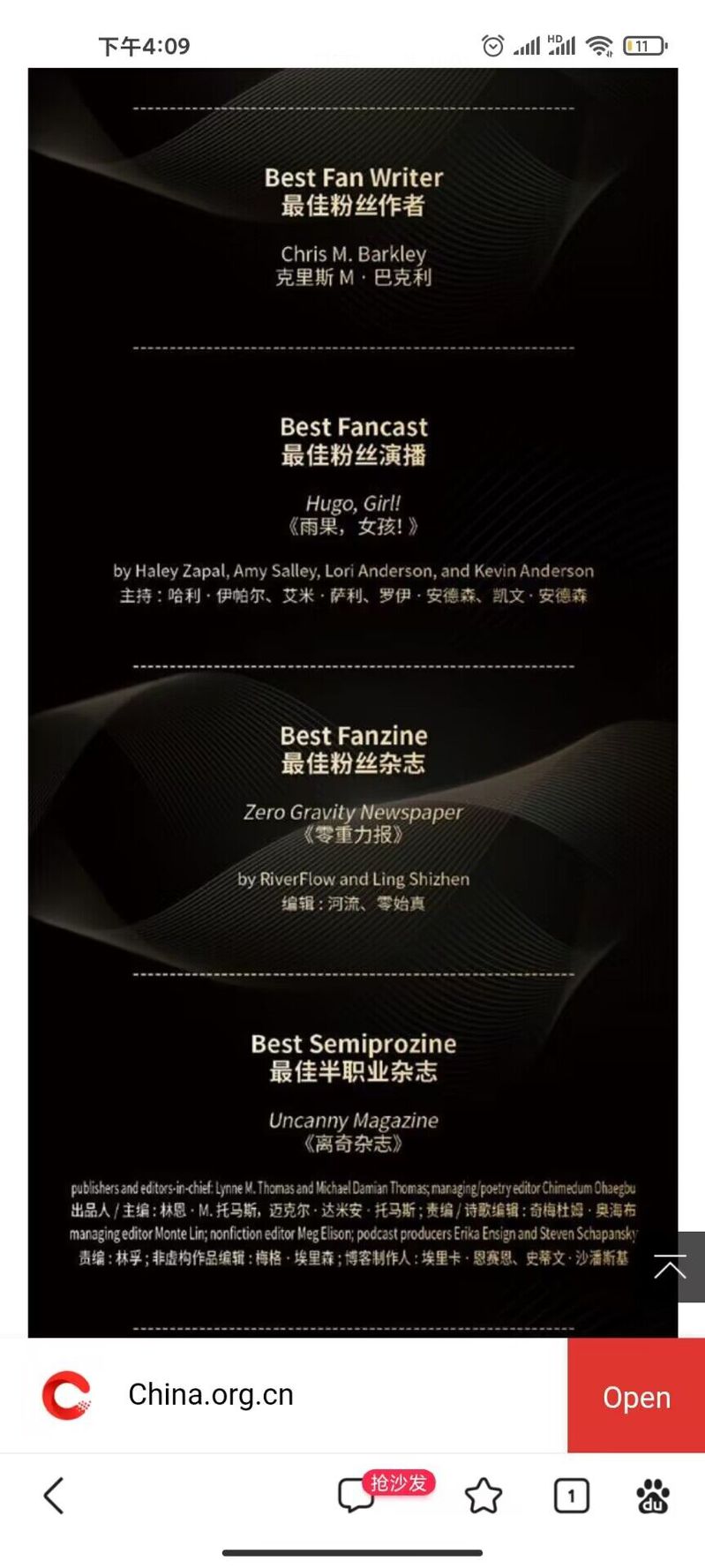 2023年第81届世界科幻大会于10月18日至22日在成都科学馆举行,世界科幻大会由世界科幻协会主办,是全球最受瞩目、历史最悠久、规模和影响力最大的科幻文化主题活动,2023年首次在中国举办。此次大会评选出17个雨果奖奖项和惊奇奖、北极星奖等荣誉,AK(中国)人文学部中文专业2205班学生温卓峰主编的科幻杂志《零重力报》获得“最佳粉丝杂志”的荣誉称号,《人民日报》、中国网、央视网等多家媒体杂志都进行相应报道。http://m.app.china.com.cn/english/template/displayTemplate/news/newsDetail/9000050/116765845.html?isShare=true