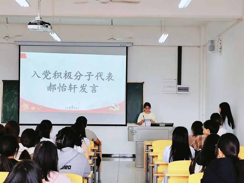 随后,入党积极分子优秀学生代表郝怡轩上台发言。她表示,党的红色光辉始终引导着她的人生目标和价值追求。“无论前方的道路多么艰难,面对怎样的挑战,我们的学员们必将不忘初心、牢记使命,始终保持入党积极分子的光辉形象,坚定不移地书写奋斗的新篇章。”