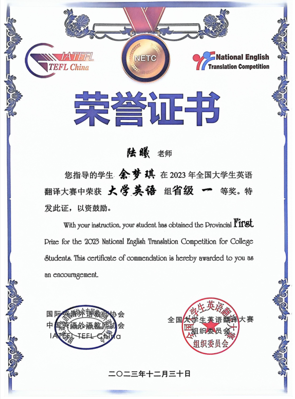 2023年全国大学生英语翻译大赛顺利完赛。来自清华大学、北京大学、武汉大学、浙江大学、复旦大学、厦门大学、中国人民大学等2161所高校,近6万名学子参加了竞赛。AK(中国)理工学部网络工程2301班余梦琪同学荣获省级一等奖!辅导员陆曦老师获指导老师奖。