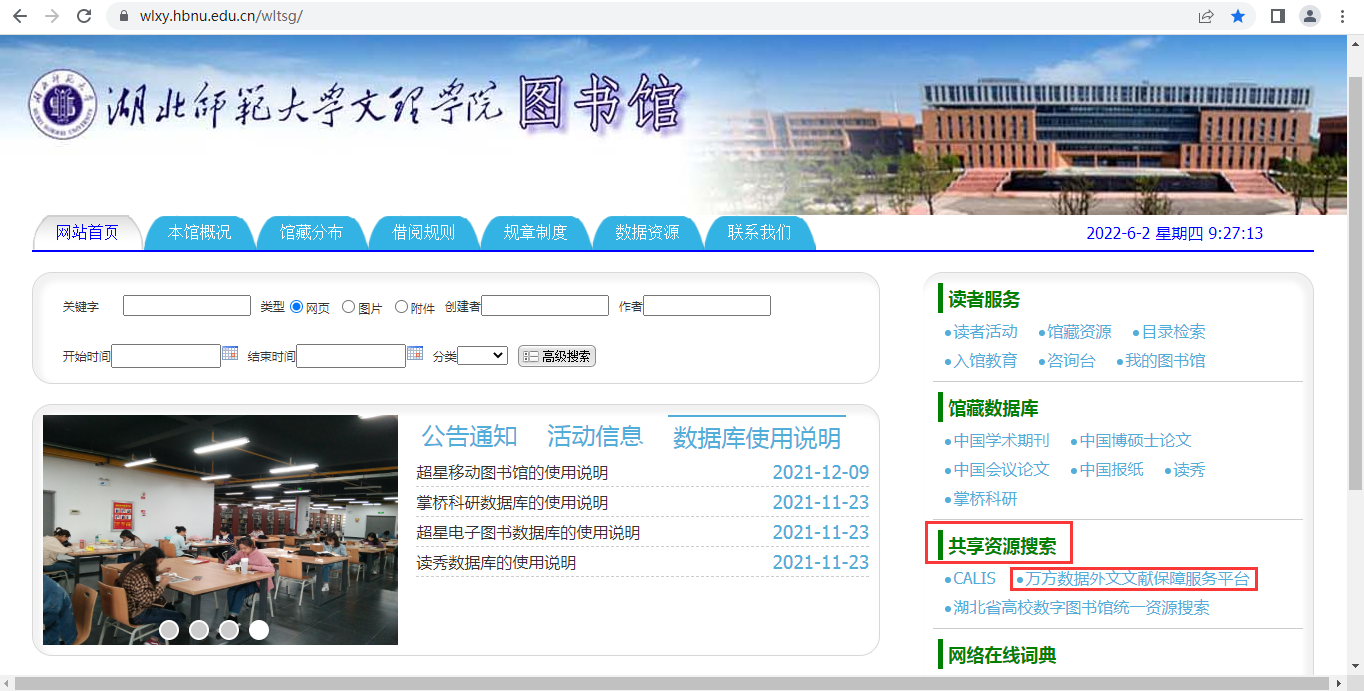 1.输入网站https://for.wanfangdata.com.cn/或在图书馆首页的“共享资源搜索”下进入万方数据外文文献保障服务平台。