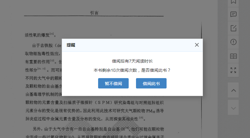 点击文献标题或详情按钮进入资源详情页面,点击“在线阅读”即可进入资源阅读;通常允许试读文献前十页,当超出试读范围,页面会提示借阅,提醒借阅时长和次数。
