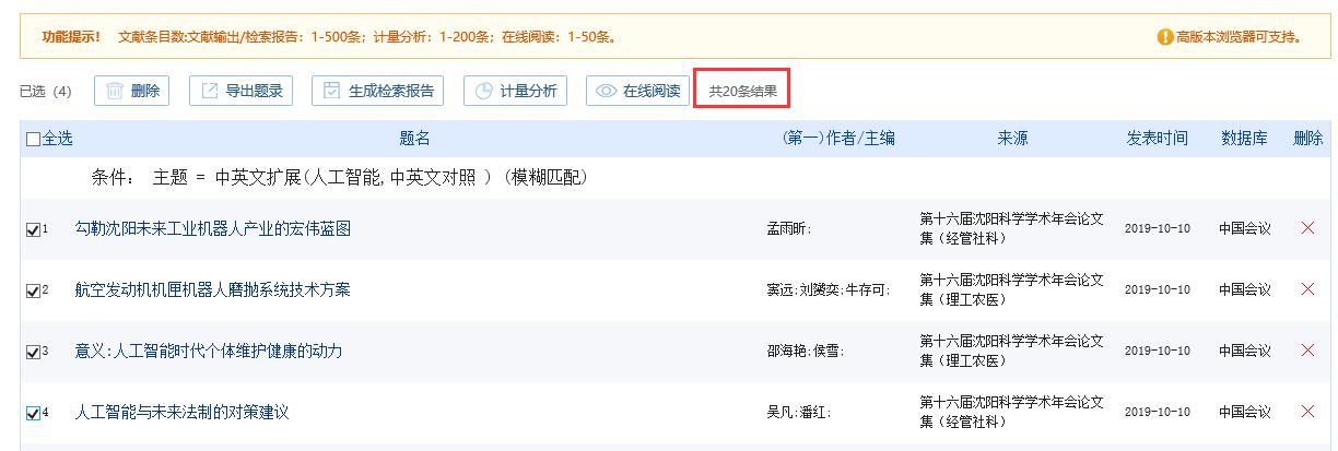 批量管理检索历史,可先单击全选或勾选检索式前复选框,再点击“取消”或“删除”按钮,对已选检索式进行批量取消勾选或批量删除的操作。