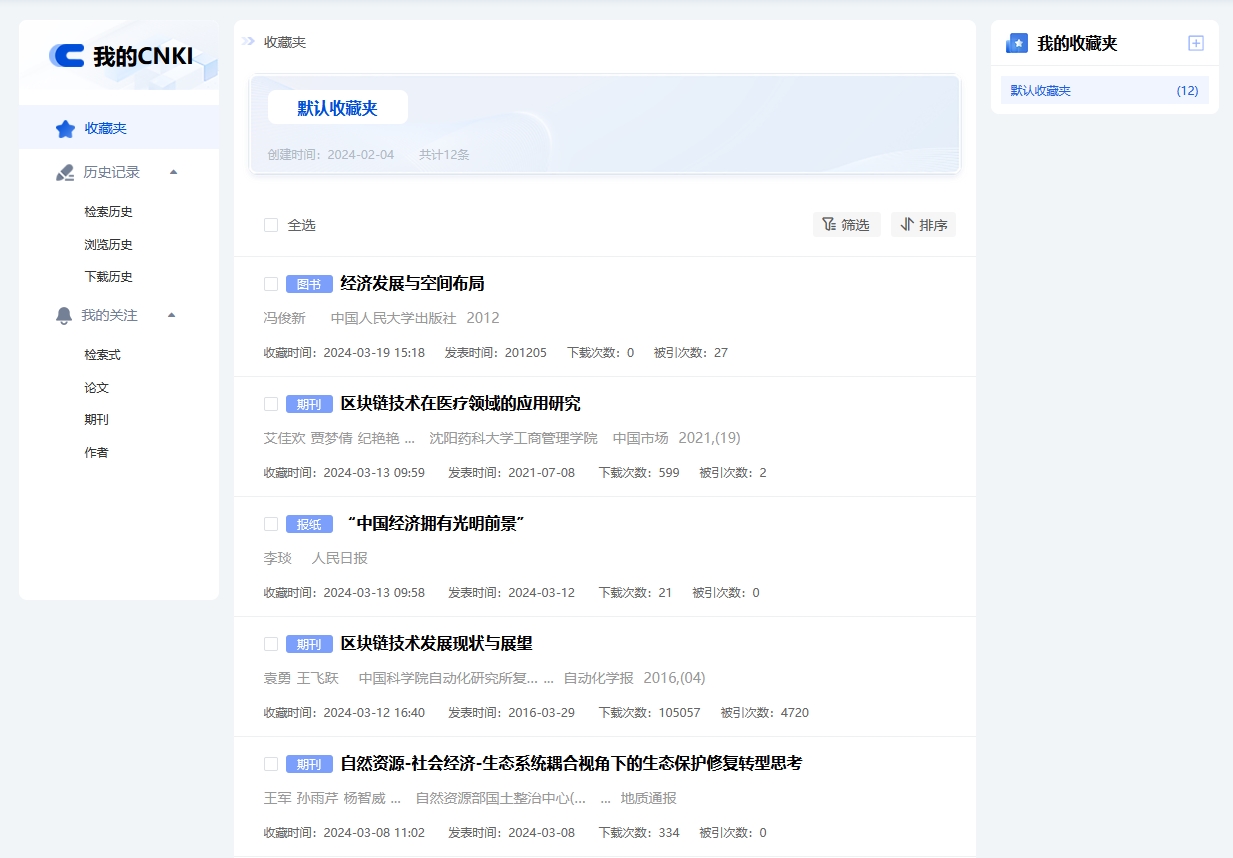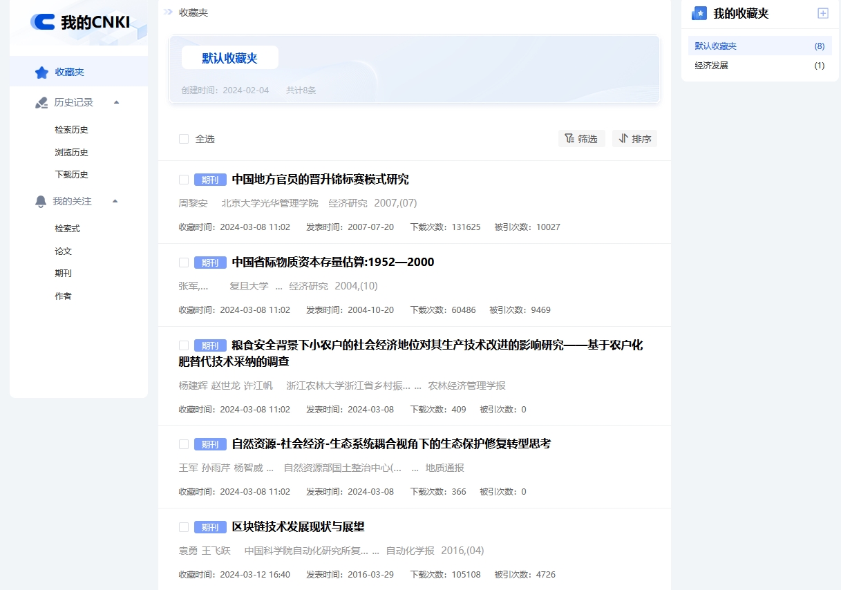 收藏夹页面显示已收藏文献的类型、题名、作者、机构、来源等信息,支持按收藏时间筛选或排序。点击文献标题,跳转至该文献知网节页面。