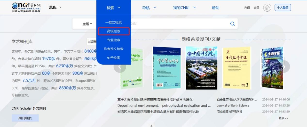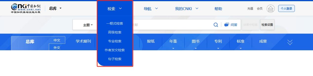 鼠标移入页头“检索”,可选一框式检索、高级检索、专业检索、作者发文检索或句子检索,点击进入相对应检索页面。