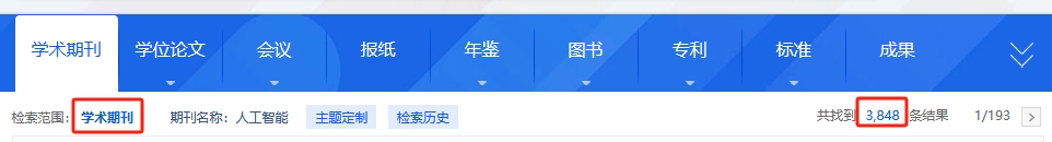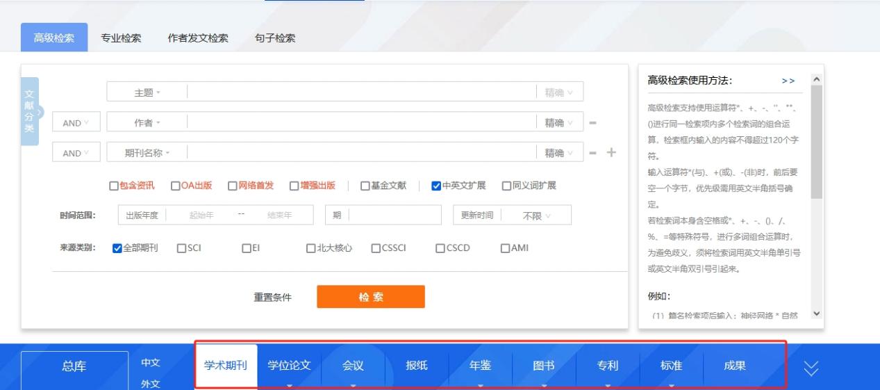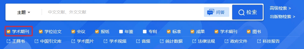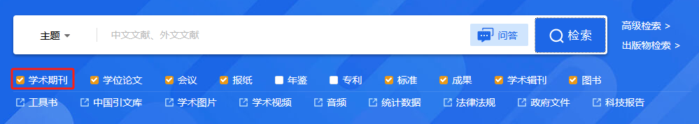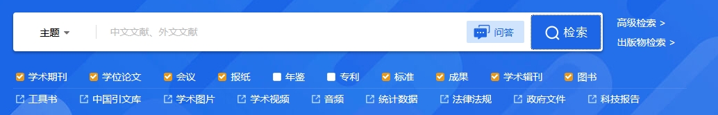 平台检索涵盖的资源类型有:学术期刊、学位论文、会议、报纸、年鉴、专利、标准、成果、图书、学术辑刊、特色期刊。