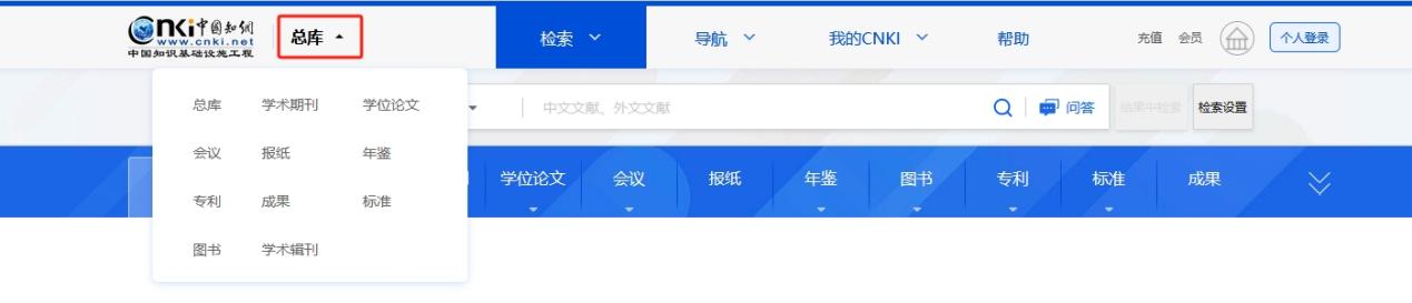 鼠标移入页头“总库”,显示总库及各单库名称,点击进入总库及各单库个性化首页。