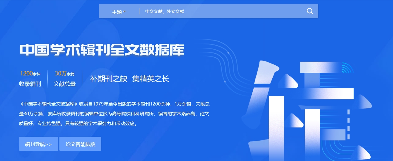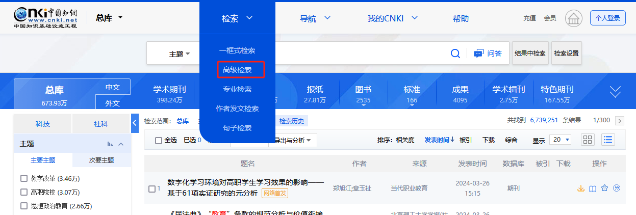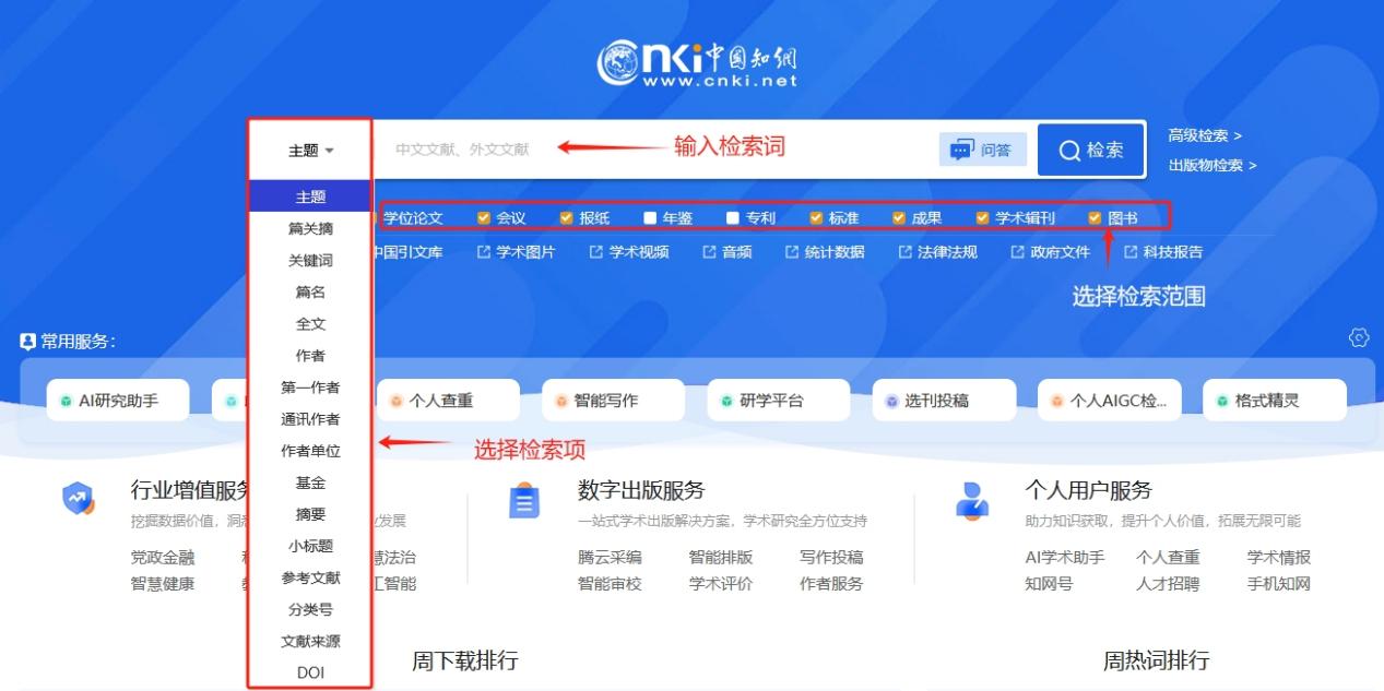 总库提供的检索项有:主题、篇关摘、关键词、篇名、全文、作者、第一作者、通讯作者、作者单位、基金、摘要、小标题、参考文献、分类号、文献来源、DOI。