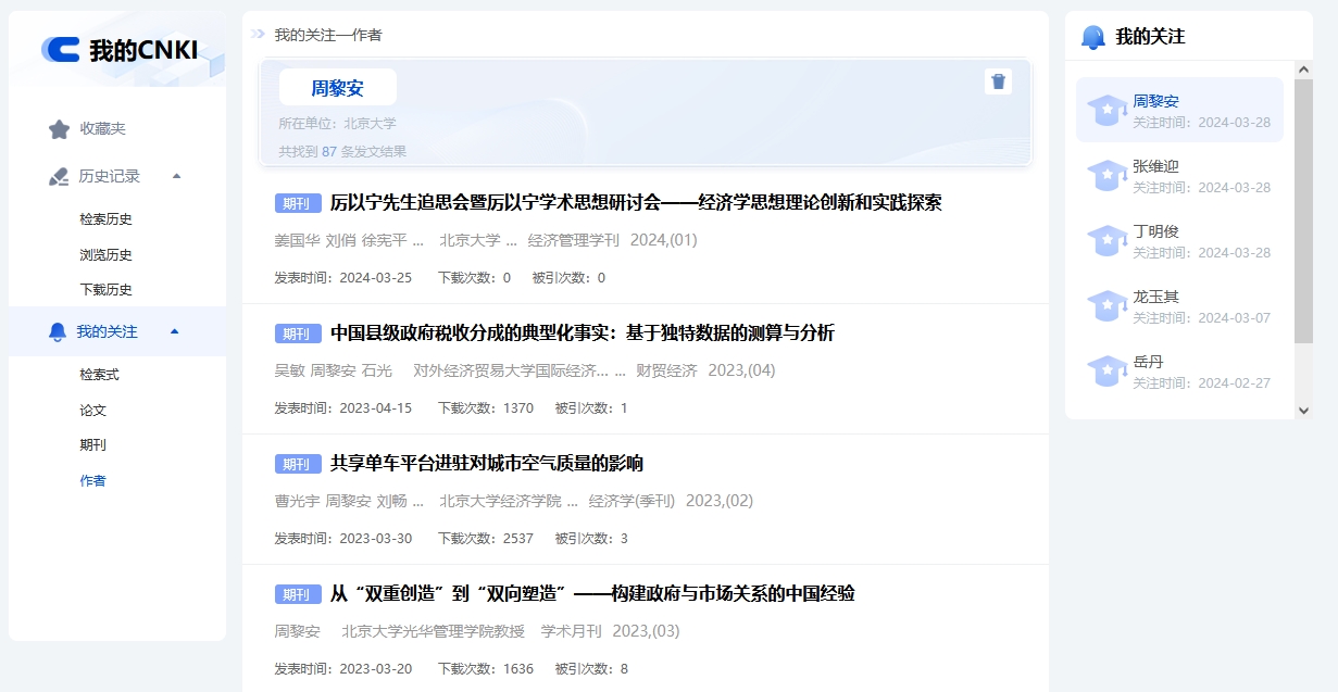 作者关注页面显示已关注作者的姓名、单位、关注时间和发表文献数,并按发表时间降序显示该作者所发表文献的类型、题名、作者、机构、来源等信息。点击文献标题,跳转至该文献知网节页面。鼠标悬停到某篇文献,点击按钮可下载或收藏该篇文献。