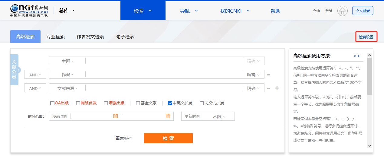 (3)在首页点击“高级检索”,在高级检索页面下方切换数据库进入单库高级检索。