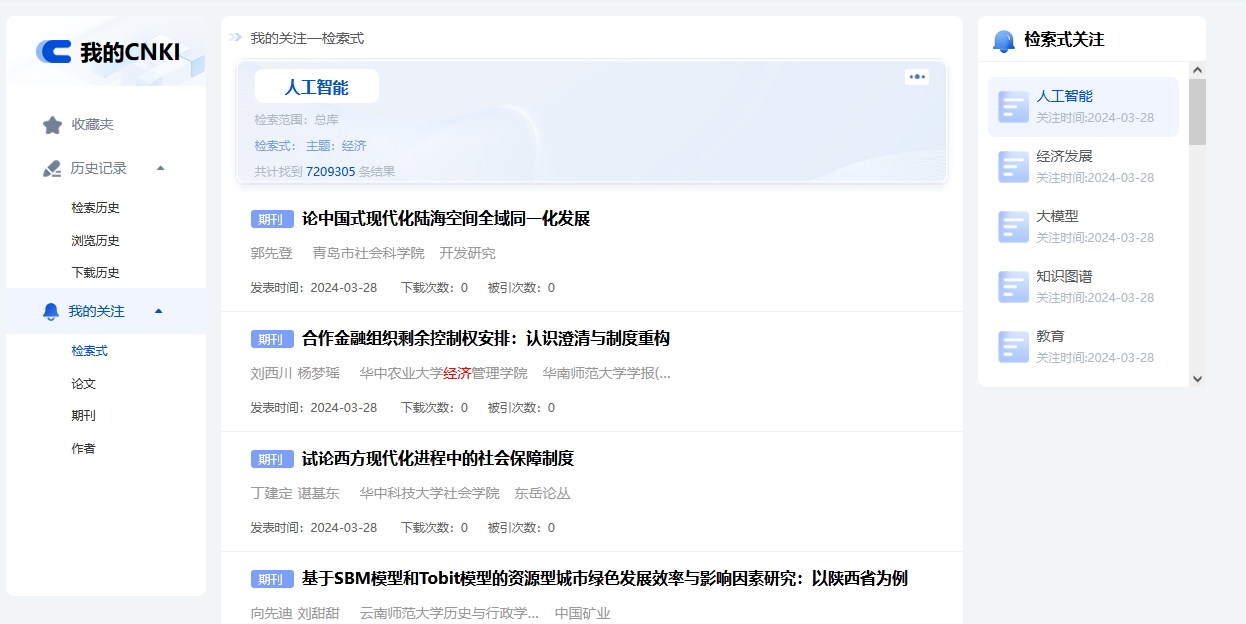 登录个人账号后,可在检索结果页点击“主题定制”,或在“我的CNKI-历史记录-检索历史”点击检索式的“关注”按钮,关注检索式。进入我的CNKI-我的关注-检索式,可查看检索式下的文献,管理已关注的检索式。