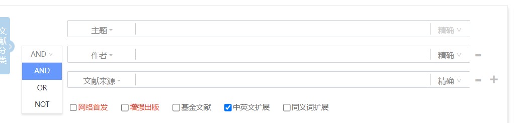 主题检索是以知网标引的主题(机标关键词)为核心检索内容,同时涵盖所有内容相关字段,在检索过程中嵌入了专业词典、主题词表、中英对照词典、停用词表等工具,并采用关键词截断算法,将低相关或微相关文献进行截断。主题检索旨在提供一种能够涵盖文章所有主题特征并综合时间特征的检索手段,适用普通用户快速查询和调研。