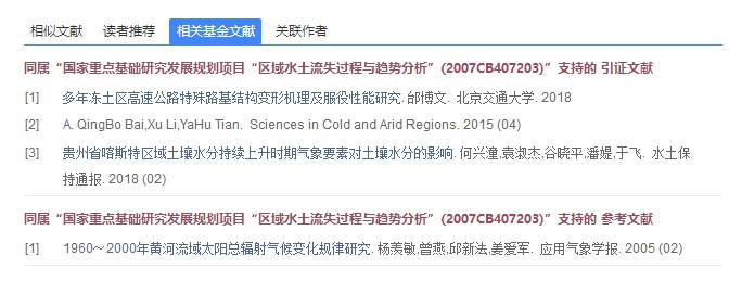 根据基金名称,可检索受到此基金资助的文献。支持基金检索的资源类型包括:期刊、会议、学位论文、辑刊。