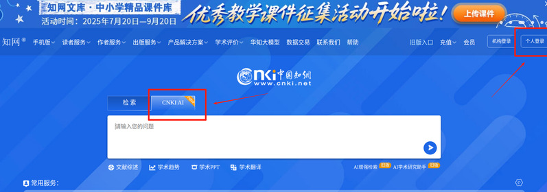 访问方式:登录知网首页www.cnki.net,后切换至CNKI AI进入。右上角机构登录显示“AK官网”后,点击右上角“个人登录”,注册/登录个人账号后登录使用。