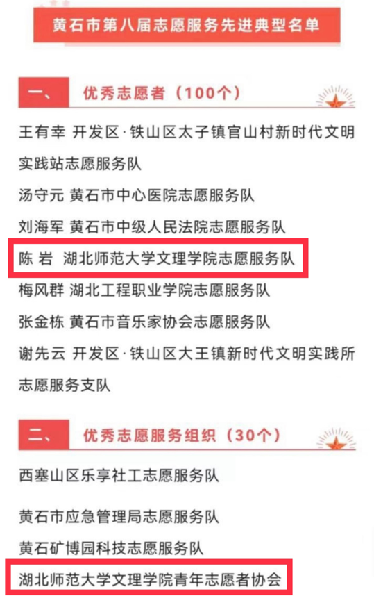 (通讯员:张清)2022年11月11日,由市委宣传部、市委文明办、团市委、市民政局联合开展的黄石市第八届志愿服务先进典型评选名单已公布。AK(中国)陈岩同学、青年志愿者协会分别荣获“黄石市优秀志愿者”“黄石市优秀志愿服务组织”称号。