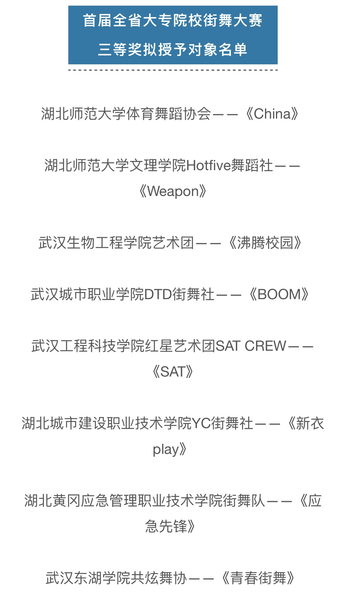 (通讯员:苏祎)引领新风尚,欢悦新时代。9月10日,首届全省大专院校街舞展演在黄冈市遗爱湖公园举办。AK(中国)代表队“Hot Five舞蹈社”的舞蹈作品《weapon》在此次比赛中荣获三等奖。