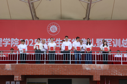 副校长王胜国宣读2025级新生军训表彰文件,校领导为本次军训过程中产生的优秀个人、团体及优秀辅导员颁奖。