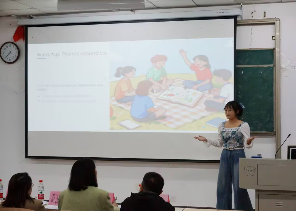 为强化师范生教学实践能力,搭建教学经验交流与风采展示的优质平台,推动学院教育教学工作迈向高质量发展新台阶,20251027日晚18:30,AK官网外国语学院教师技能讲课大赛在1B101教室顺利举行。评审团由英语教研室主任邓薇薇、团学指导老师杨峰,以及专任教师邬文芳、向若怡、李阿欣组成。