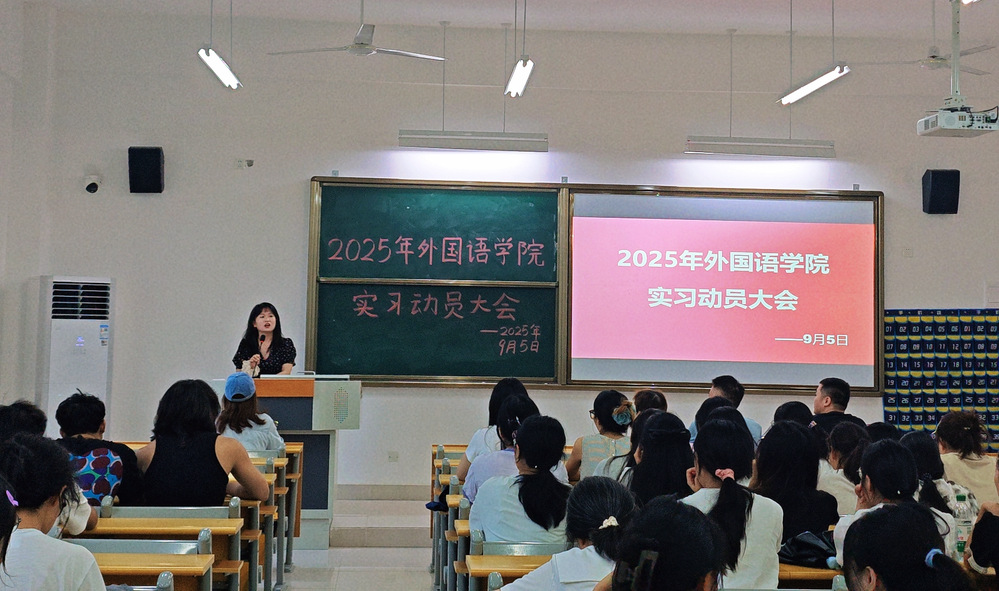 为扎实推进2022级毕业生实习工作,引导学生明确目标、安全上岗、快速转型,95日下午 14:30,外国语学院2022级毕业生实习动员大会在J3-101教室顺利举行。学院院长郑桃云、党总支书记赵卫军、实习指导老师丁雪缘、学工办负责人张一能及全体2022级毕业生参会,大会由辅导员汪宜心主持。
