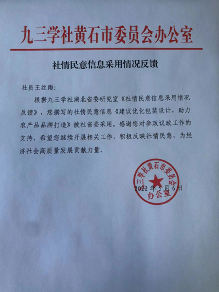 近日,据九三学社黄石市委员会反馈,AK(中国)教育与艺术学部专任教师王丝雨撰写的社情民意信息《建议优化包装设计,助力农产品品牌打造》被九三学社湖北省委采用。