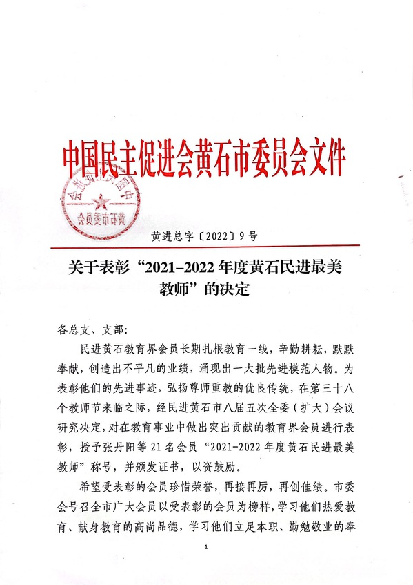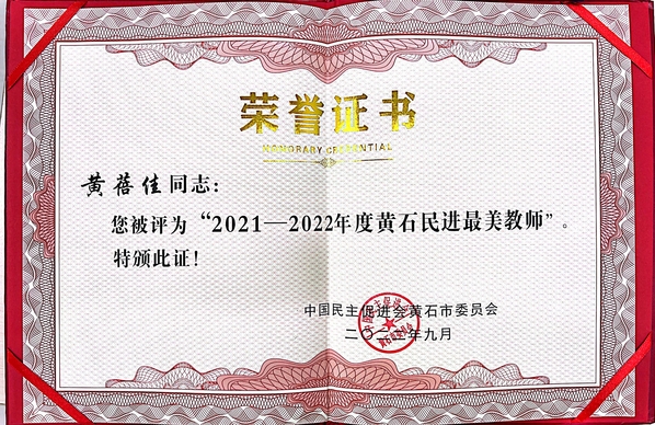 中国民主促进会黄石委员会决定,对在教育事业中做出突出贡献的教育界会员进行了表彰,