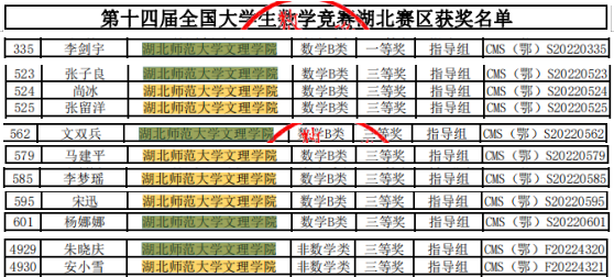 在省赛(第十一届湖北省数学竞赛)中,数学类:一等奖1项(李剑宇),三等奖5项(陈顺利、符梦雪、魏声祥、邓道焜、刘世乐);非数学类三等奖1项(王敏艺)。