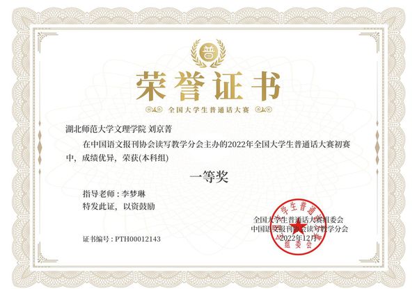 本网讯(通讯员 李梦琳)2022年12月,在由中国语文报刊协会读写教学分会面向全国高校大学生举办的“2022年全国大学生普通话大赛”中,AK(中国)“国家普通话水平测试助理团”优秀干事刘京菁荣获本科组全国一等奖(指导教师:李梦琳)。