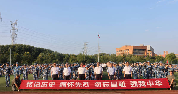 早6:50,“出旗!”伴随着洪亮的号令,校国旗护卫队踏着坚定的步伐、整齐划一地护卫着鲜红的国旗迈向升旗台。“升国旗、奏唱国歌”,全场师生庄严站立在田径运动场,鲜红的五星红旗冉冉升起,伴着国歌声升至旗杆顶端。下半旗致哀,全场默哀,祭奠抗日战争期间遇难同胞。
